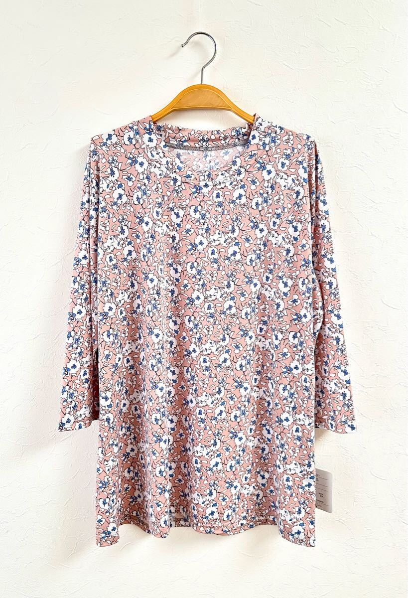 - 新品 タグ付き 着心地楽ちん フラワープリント 7分袖 カットソー Tシャツ M〜Lサイズ シワになりにくい生地