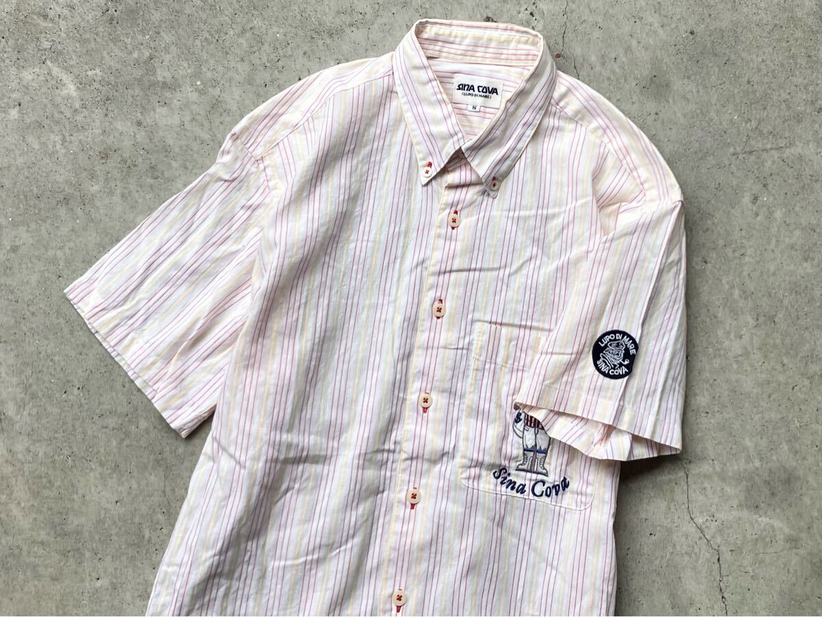 > SINA COVA ボタンダウン仕様 半袖シャツ S シナコバ メンズ 刺繍 ワッペン ストライプ