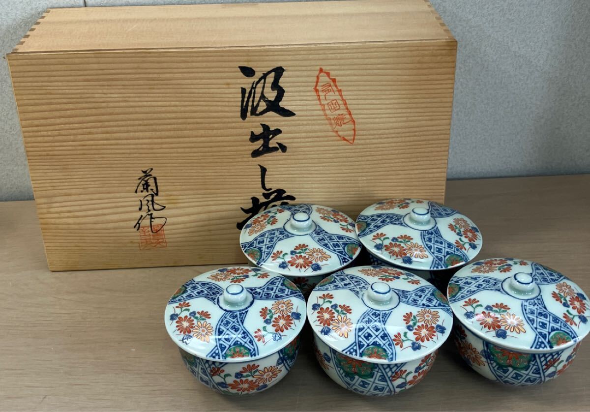 - 【有田焼 蓋付湯呑み 5客セット】煎茶道具 和食器 蓋付湯呑 陶磁器 染付 木箱付き 花柄【A9-4】0703
