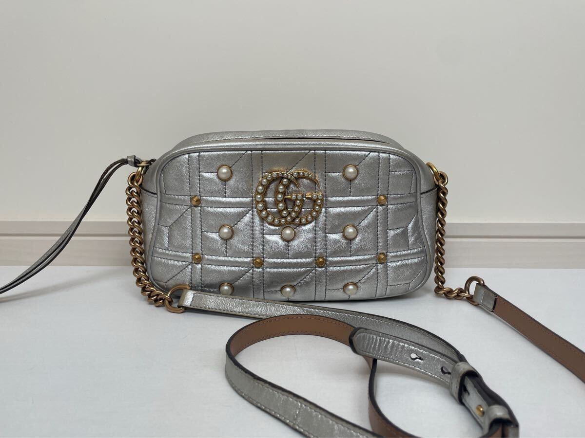 - グッチ GUCCI GGマーモントパールキルティングバッグ パール シルバー ショルダーバッグ スタッズ チェーン