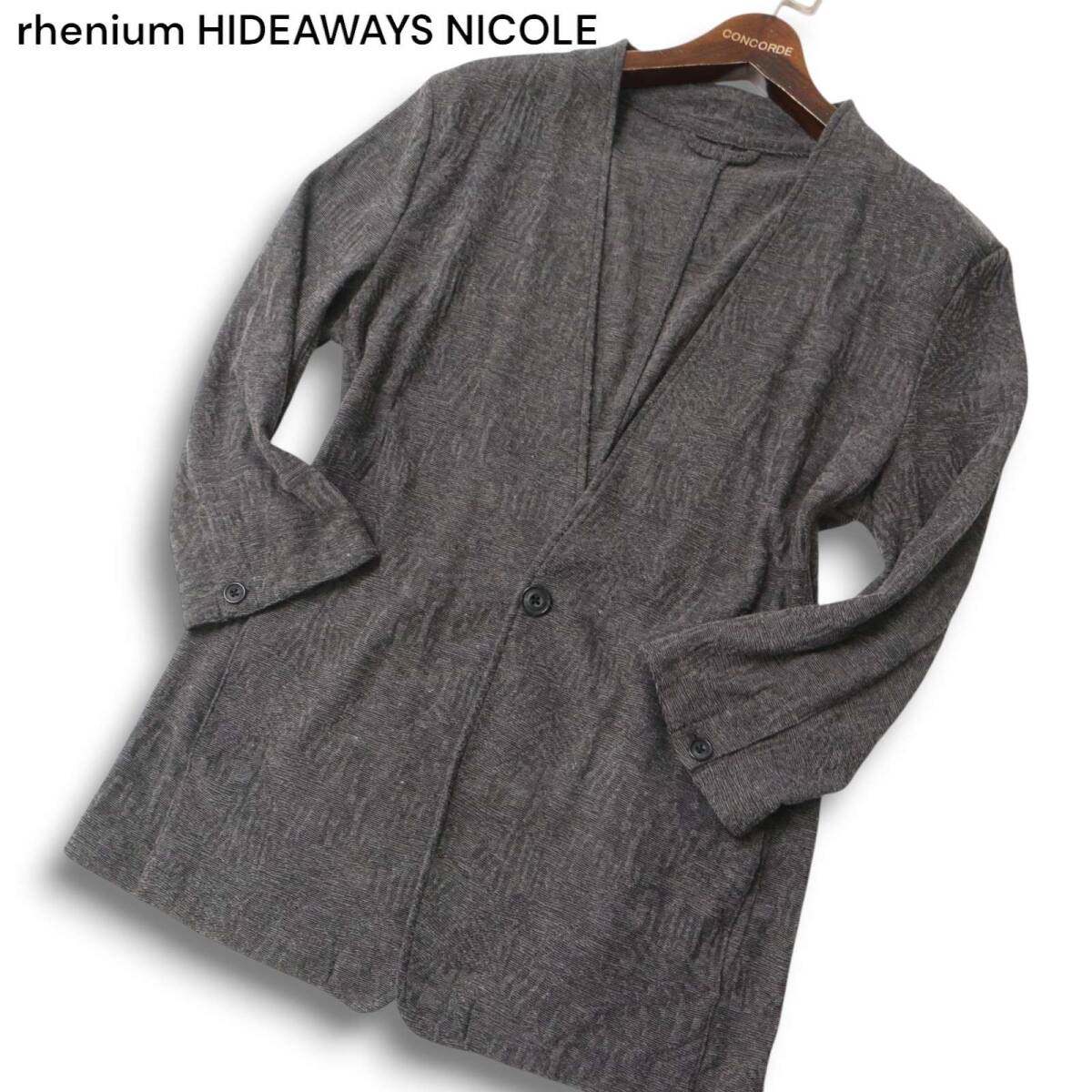 - rhenium HIDEAWAYS NICOLE ハイダウェイ ニコル 総柄★ レニウム ノーカラー 七分袖 1B ジャケット Sz.48 メンズ グレー