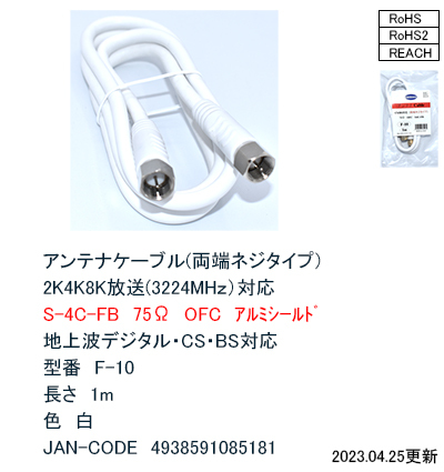 - 【F-10】アンテナケーブル(白) 1.0m 同軸 S4C-FB 地デジ対応 ネジ式