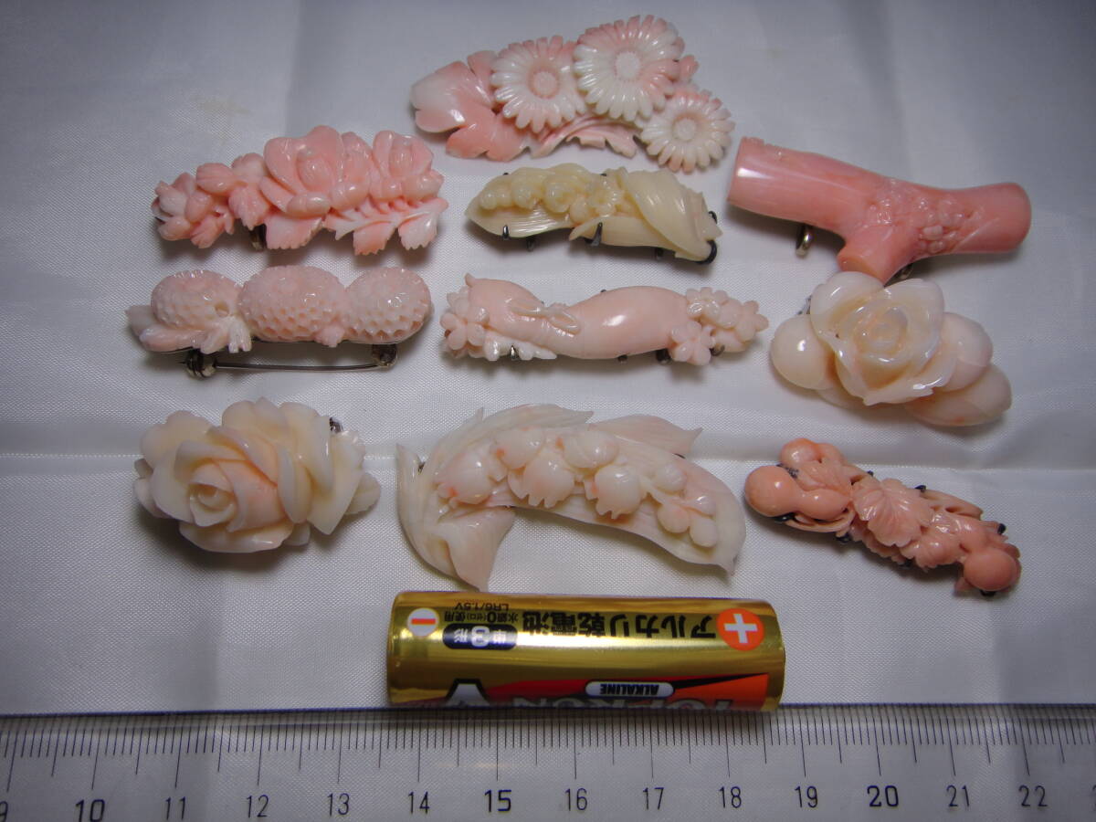 - 珊瑚 サンゴ さんご コーラル 繊細彫刻 帯留め ブローチ 10点おまとめ アンティーク レトロ ヴィンテージ Y736