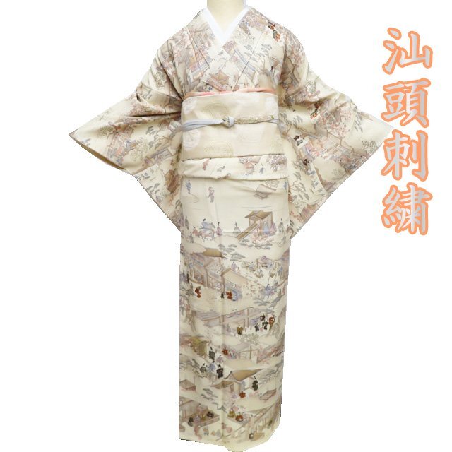 > 特選 訪問着 着物 未使用 正絹 袷 汕頭刺繍 スワトウ 平安絵巻文様 金糸 淡黄蘗色 多色 身丈161cm 裄65cm M きもの北條 A1230-2