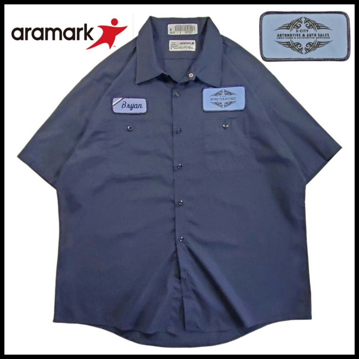 - w214/ 古着 ARAMARK 半袖 ワークシャツ XL ワッペン E-CITY AUTOMOTIVE & AUTO SALES 洗濯プレス済 ネコポス発送