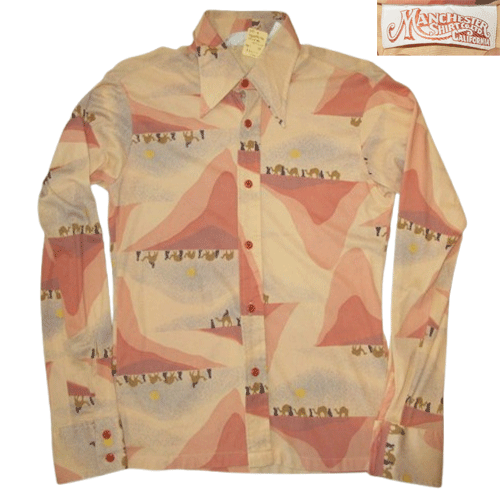 > ★送料込み★ 70's ヴィンテージ 古着 MANCHESTER SHIRT CO ディスコシャツ ポリシャツ シルクロード柄 ラクダ柄 ヒッピー レトロ古着