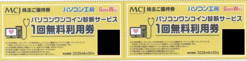 - MCJ 株主優待券 パソコンワンコイン診断サービス1回無料利用券 2枚 有効期限:2026年6月30日 普通郵便・ミニレター対応可