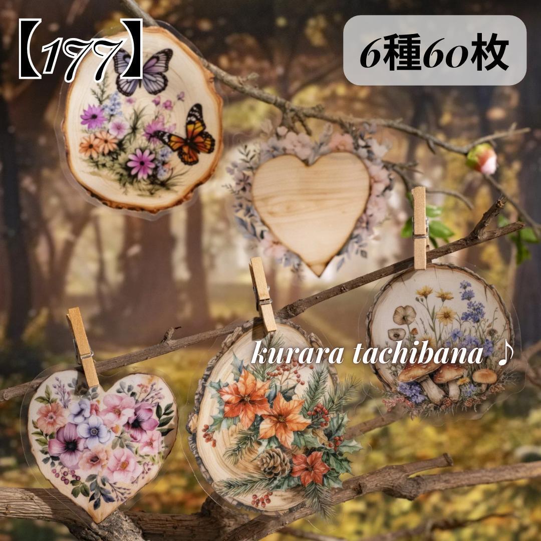 > 【177】シールステッカー 花 切り株 PET コラージュ素材 装飾 自然 ジャンクジャーナル スクラップブッキング アルバム デコ 蝶々 6種60枚