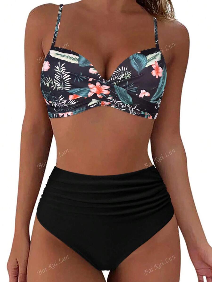 - レディース 水着 ビキニセット 2枚 セット レディース セクシー プッシュアップ ビキニ水着 ランダムフローラル 3点セット ビ