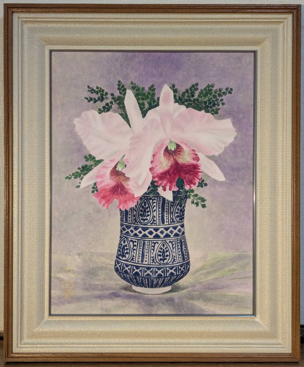 - 【真作】絵画 久保吉郎 日本画10号 カトレア 静物画 箱・黄袋入 X191