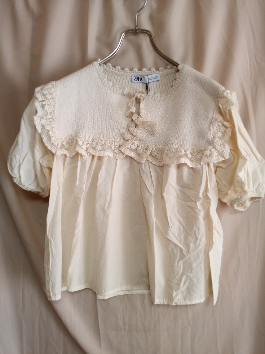 - 7724 ■■ ZARA レース&人っと素材 異素材コンビトップス サイズM アイボリー