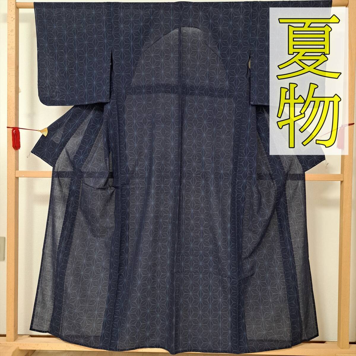 - 即決■着物の越田■裄66身丈157 化繊 小紋 夏物 絽 美品 しつけ糸付き 居敷当て付き 麻の葉文様 ■ま08E12a