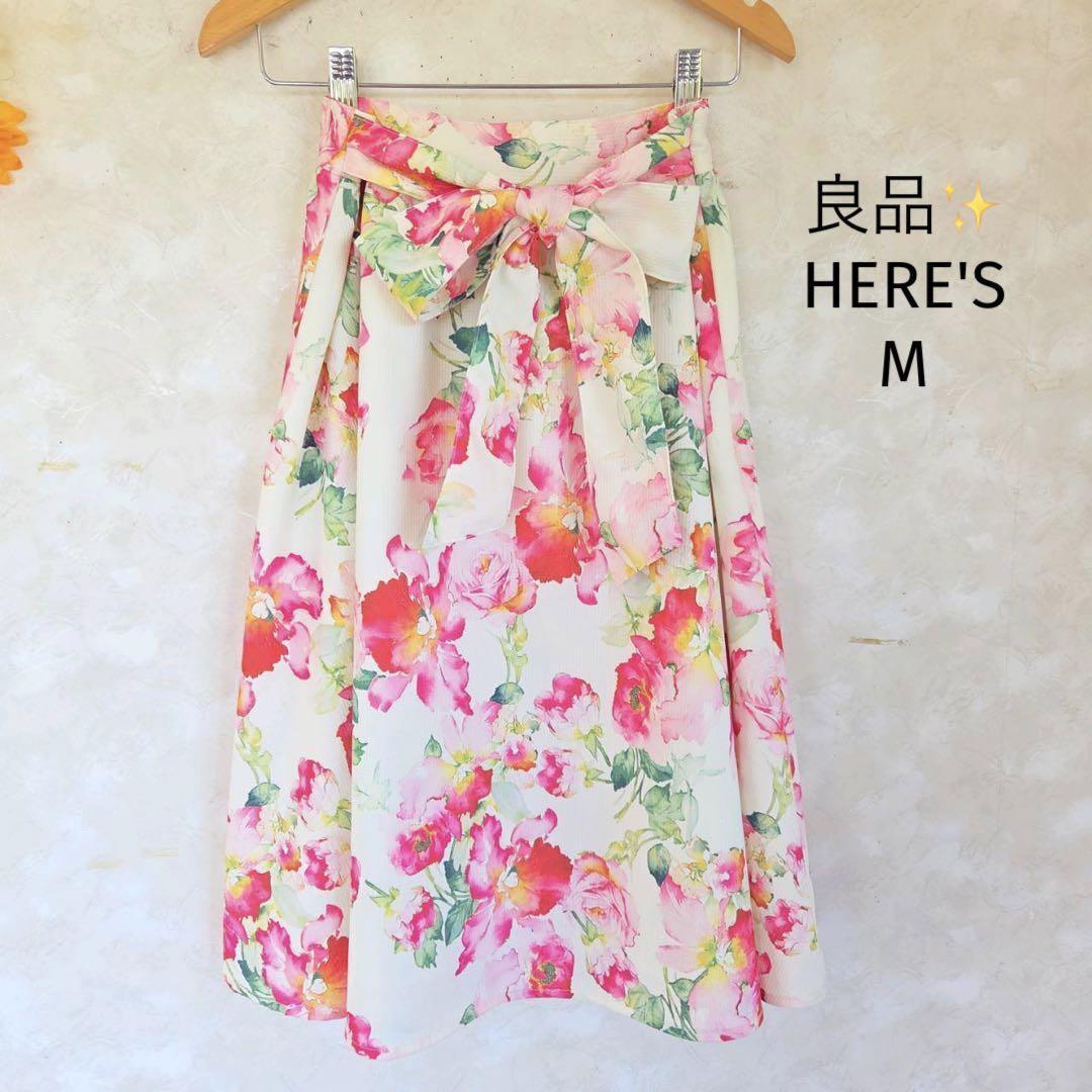 - ヒアーズ HERE'S イトキン 花柄スカート【M】フロントリボン 膝下丈