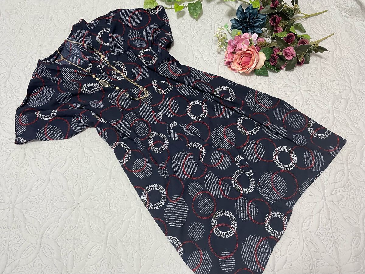 > ■M~L(表記) LL~3L~4L■新品■さらさらVネック重ね着風デザイン*丸柄チュニック・ワンピ■紺系