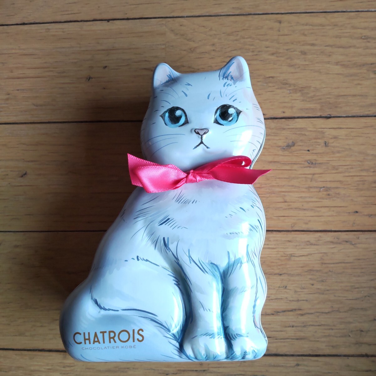 - お菓子缶 猫型カンカン リボン付き 中身無し