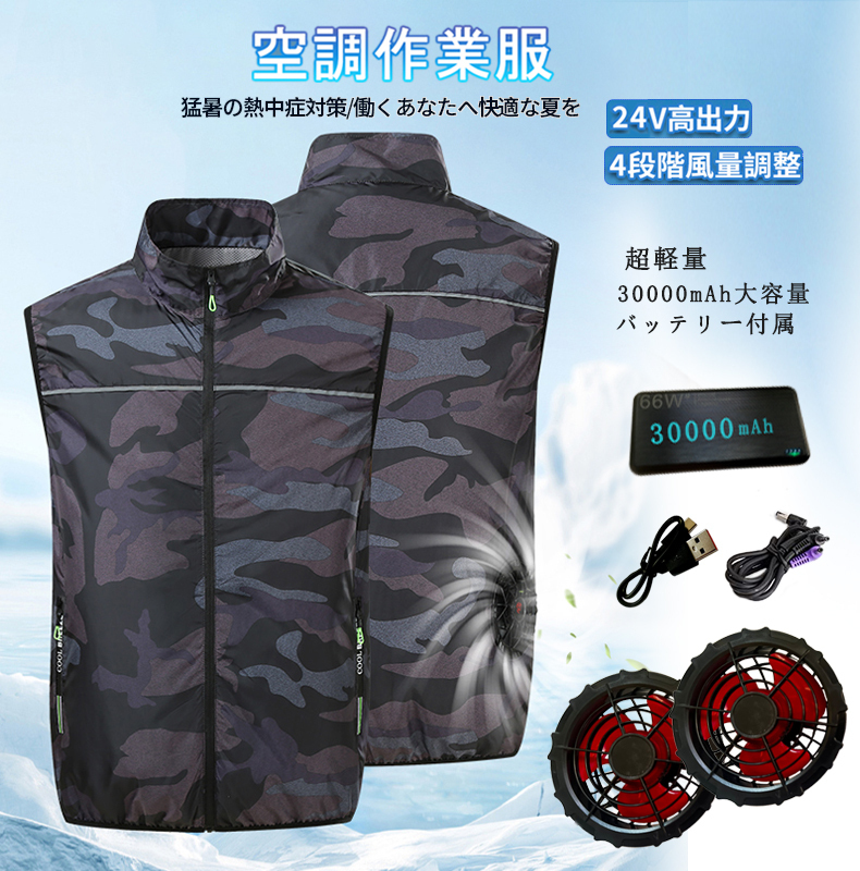 - 【24V超高出力】空調作業服 ファン付き ベスト 30000mAh大容量バッテリー付属 ベスト ファン付き作業服 薄型 迷彩3XL