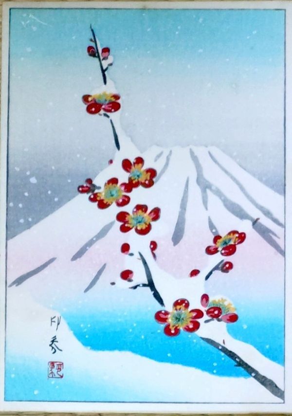 - f25071012〇彩色木版画 ハガキサイズ 富士山 グリーティングカード 錦絵 浮世絵 昭和年代〇和本古書古文書