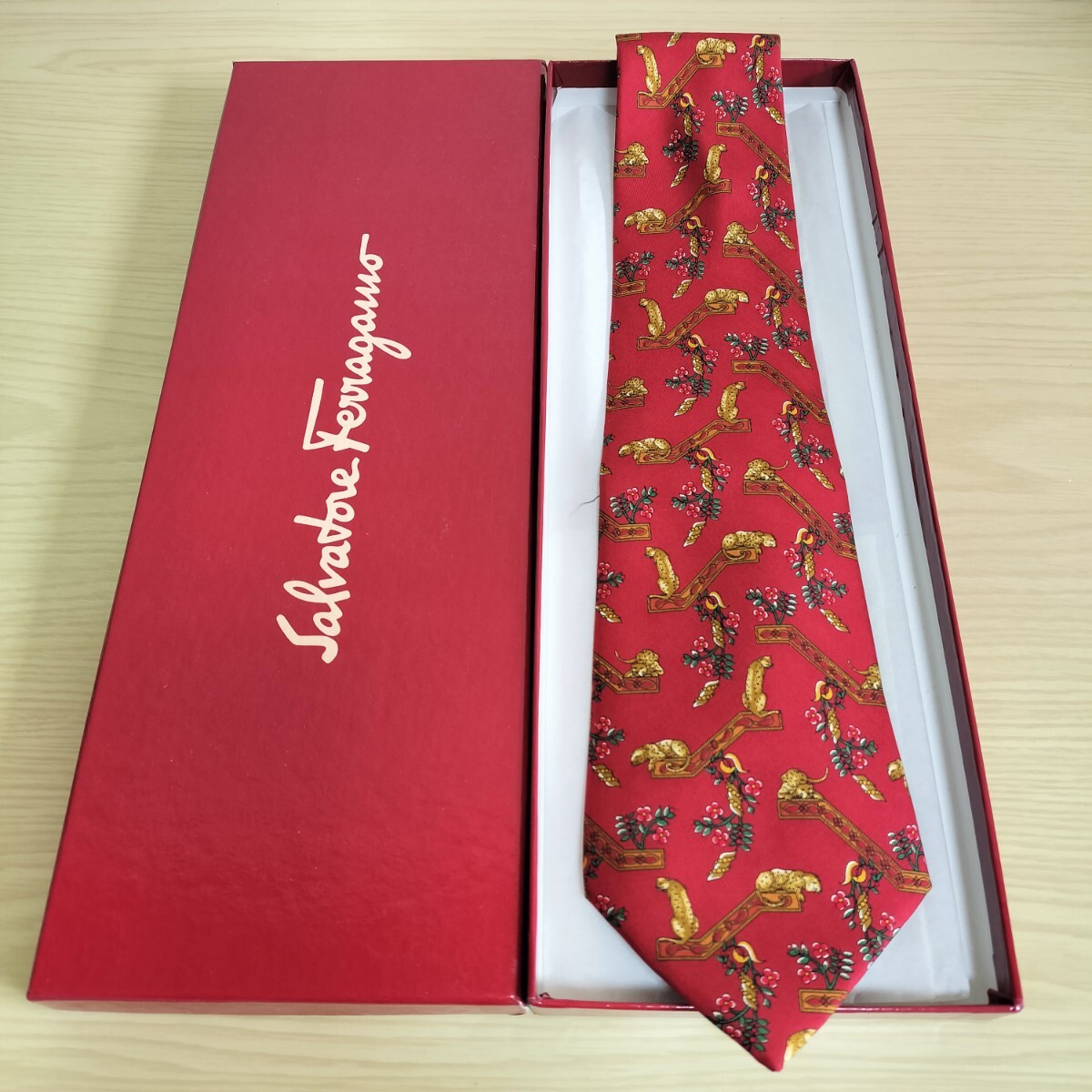 - Salvatore Ferragamo(サルヴァトーレフェラガモ)赤チーター花模様ネクタイ