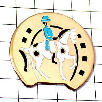 - ピンバッジ・白い馬に乗馬ブルーの乗馬服の女性ゴールド金色の蹄鉄◆フランス限定ピンズ◆レアなヴィンテージものピンバッチ