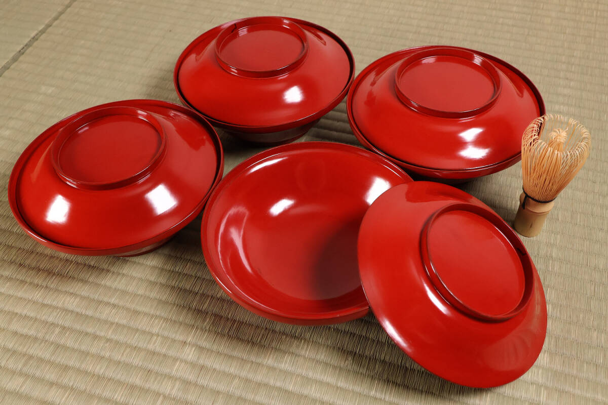 - 漆芸 明治期 朱塗 大平椀 四客 幅17.3cm 木製漆器 茶懐石 会席 宴席 煮物椀【CM235】