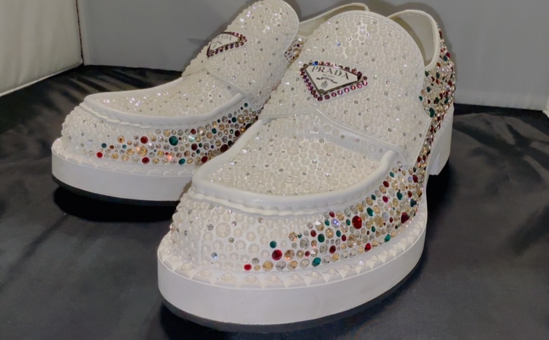 - 【MIXクリスタル 35万円】長身プラス!PRADA ローファー スワロフスキー クリスタル 白 ラインストーン 限定 シューズ ブーツ ジャケット