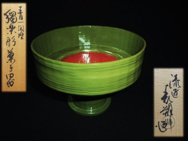 - 【睦】 青一閑塗 鈴木表朔 作 一閑塗燭楽形菓子器 本漆器 天然木 茶道具 時代物 在銘 逸品 美品 共箱■