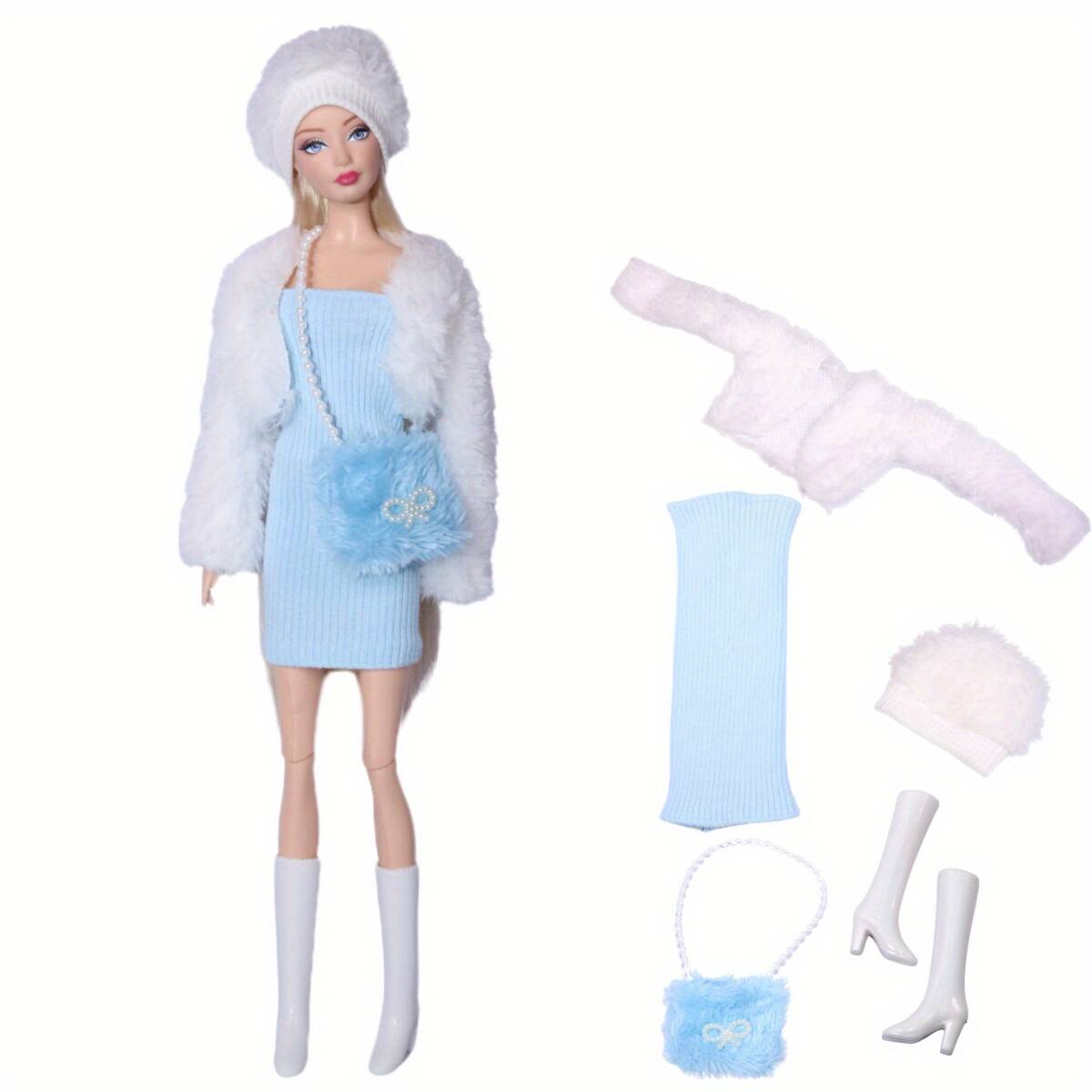 > 着せ替え人形 ファーコート 白 ニットワンピース 帽子 ブーツ 交換衣装 1/6スケール 服 女性 レディースバービー人形サイズ ドール t7390