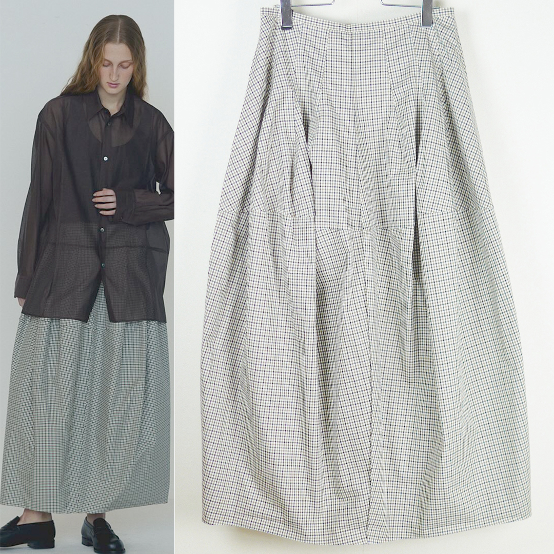 > BLAMINK ブラミンク 24SS コットン チェック ダーツ ロングスカート38 カーキベージュ×ネイビー系 Drawer バルーンスカート
