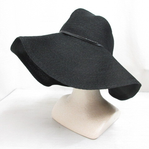 > コムサデモード COMME CA DU MODE つば広 麦わら 帽子 ハット 57.5cm 黒 ブラック マニラ麻混 本革レザー装飾 レディース