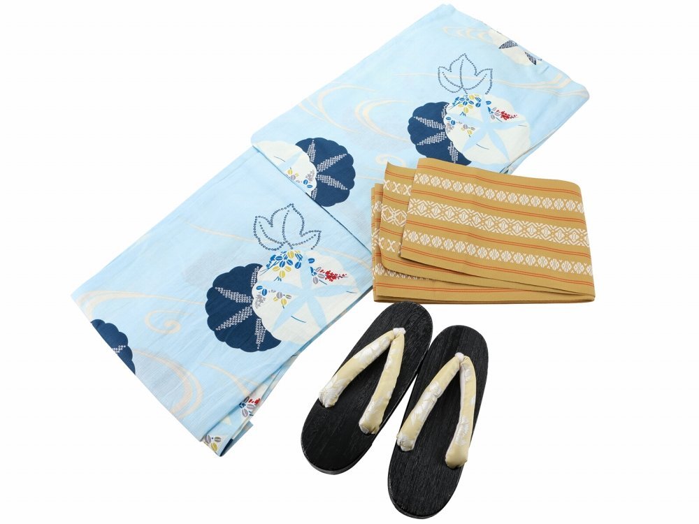 - ◆涼しい◆綿麻 お仕立て上がり浴衣 3点セット 献上柄 浴衣帯 桐下駄 フリーサイズ 水色 3yk-196-b【お祭り 盆踊り ゆかた おしゃれ】
