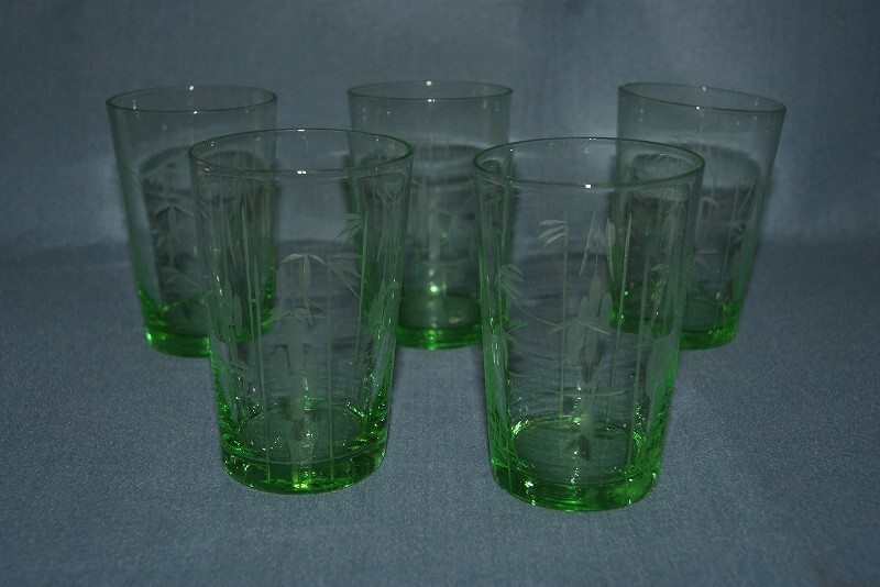 - A745★昭和初期オブジェ*傷なし美品グリーン グラス5客(ブラックライト当てましたウランガラス違います