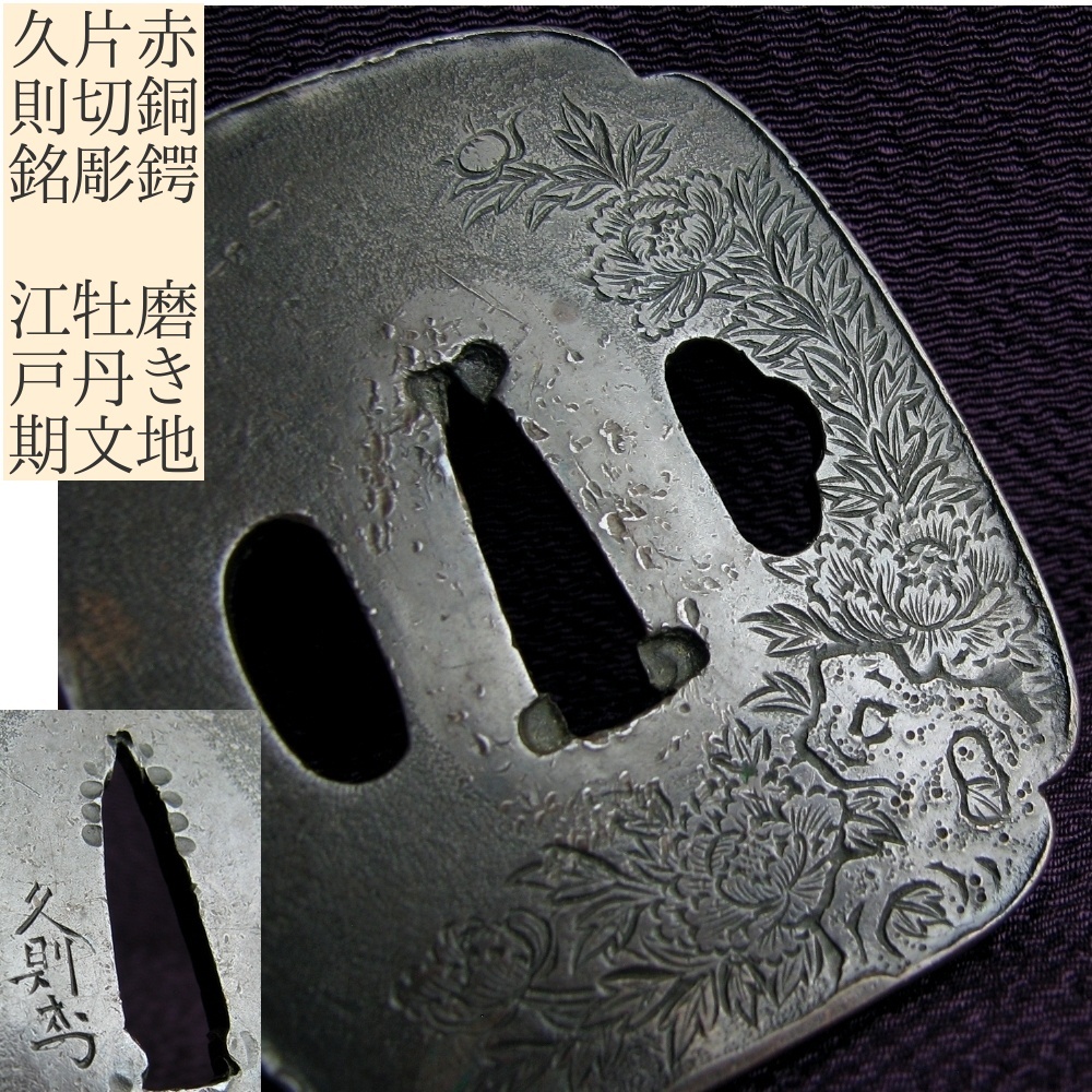 - 時代武具 鍔 [銘:久則] 赤銅磨き地 片切彫 牡丹の図 桐箱付 江戸時代/鐔/24h064