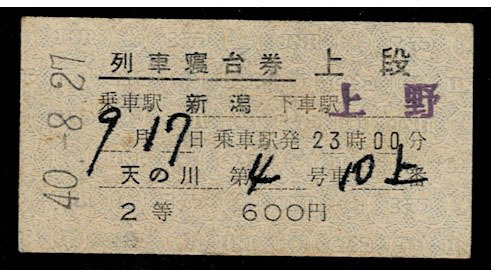 - 国鉄 信越本線 急行 天の川 2等 寝台券 新潟から上野 昭和40年 列車名時刻印刷