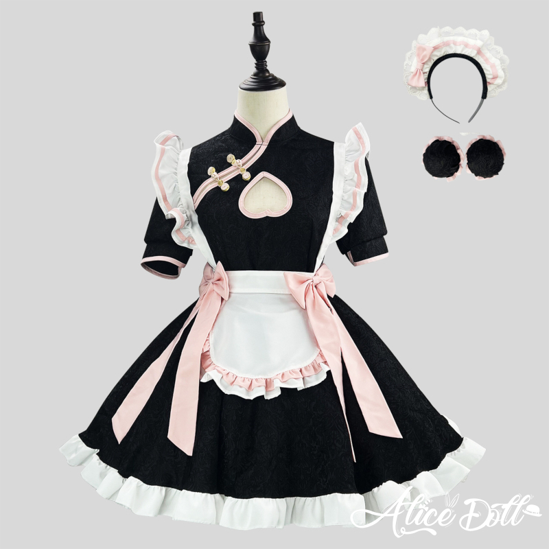 > ゆめかわいい 中華風 メイド服 チャイナメイド チャイナ服 チャイナドレス 露出 ワンピース エプロン 髪飾り付き コスプレ セット 甘かわ
