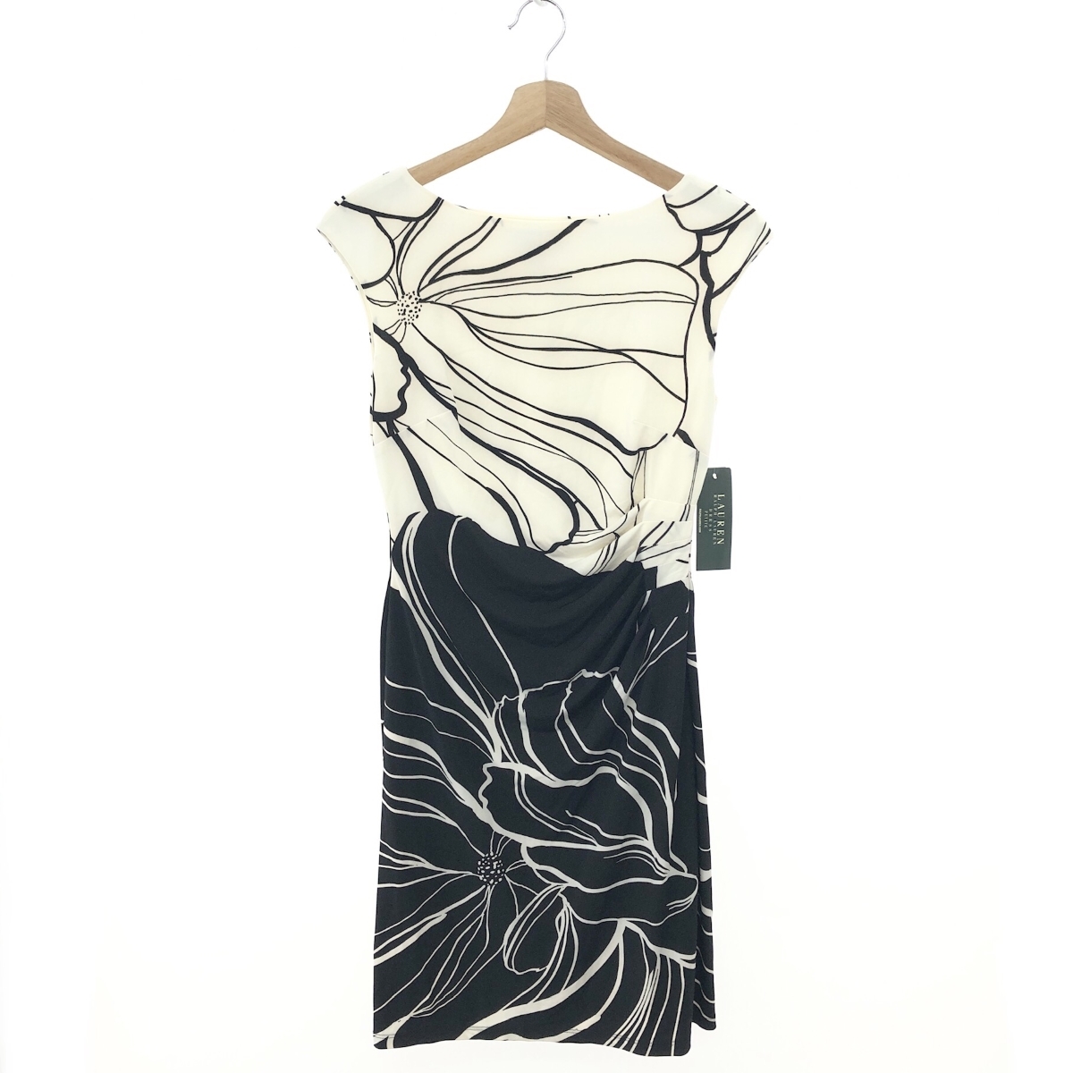 - 新品同様◆LAUREN ローレンラルフローレン サイドシャーリング フラワープリント ワンピース サイズ:6P◆ ブラック/ホワイト レディース