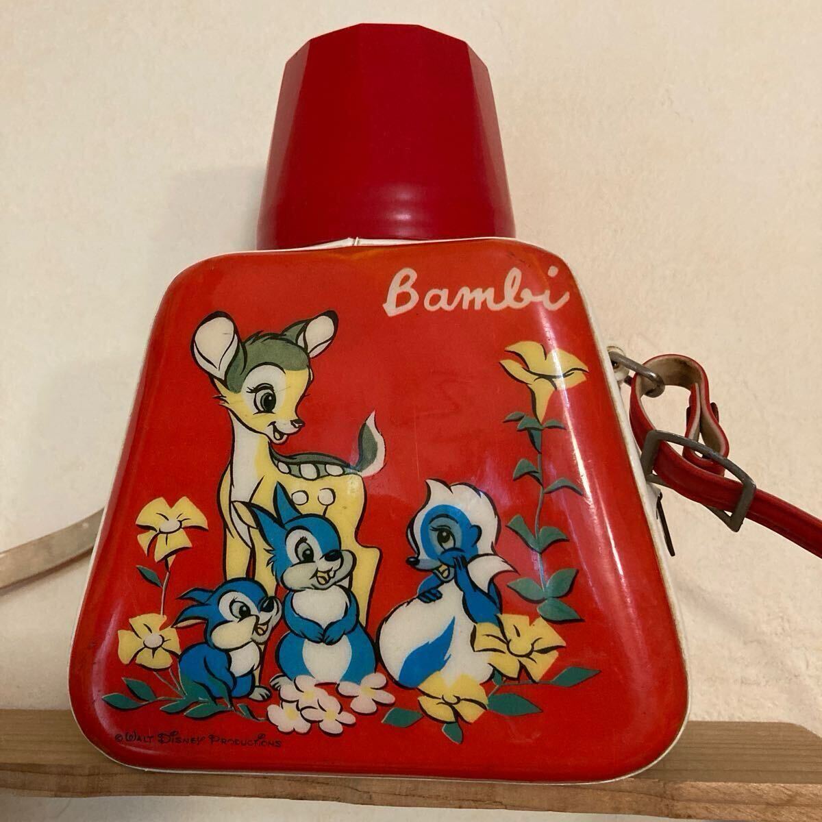 - ディズニー バンビ 水筒 象印マホービン 昭和レトロ 当時物 記名部分切り取り 難あり 子鹿 うさぎ スカンク 赤 おまけ 手作り水筒カバー