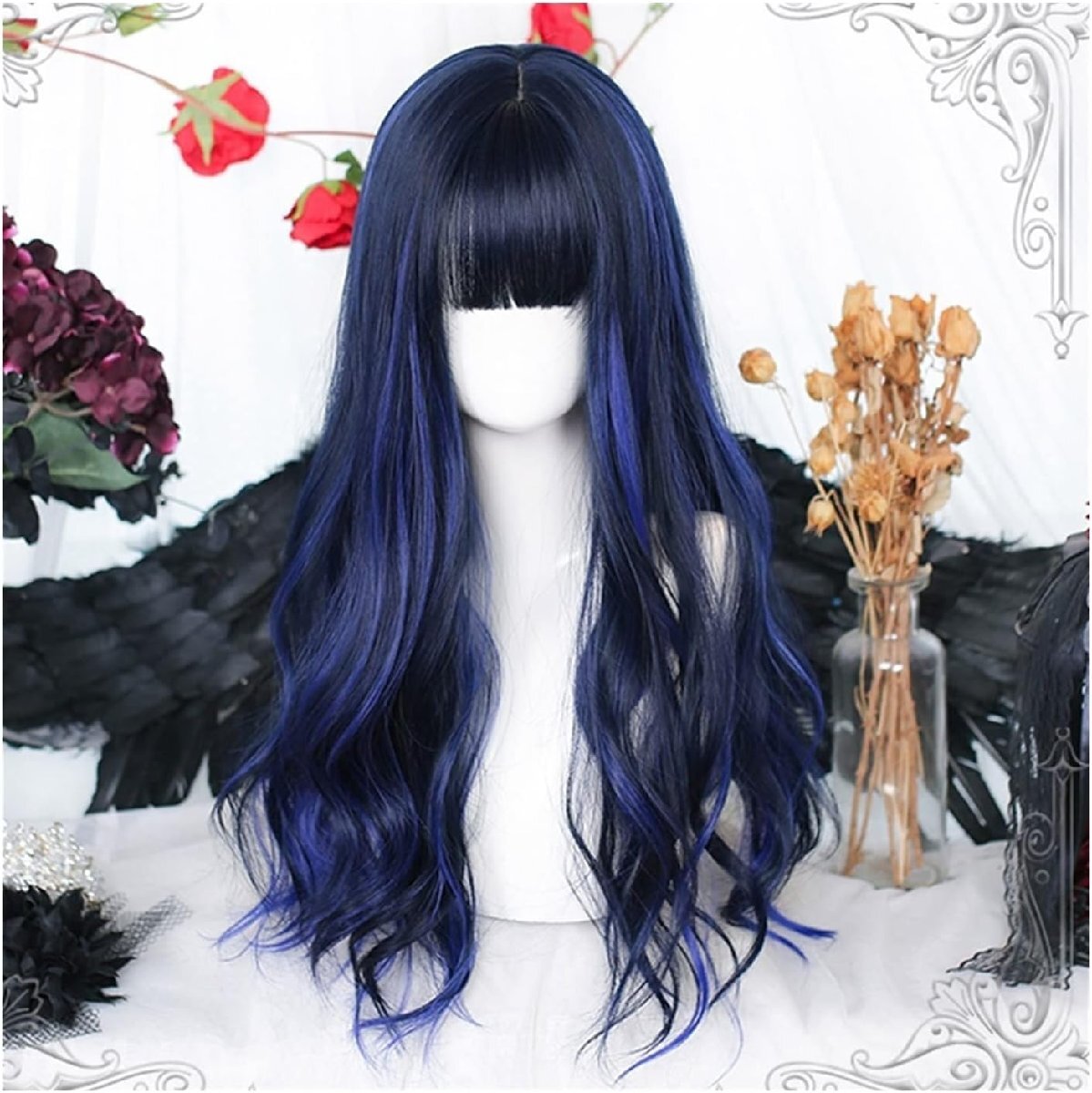 - 女性のためのきれいな前髪と黒青のかつら、前髪のある長い巻き毛のウェーブのかかった髪のかつら自然な合成コスプレ交換用かつら