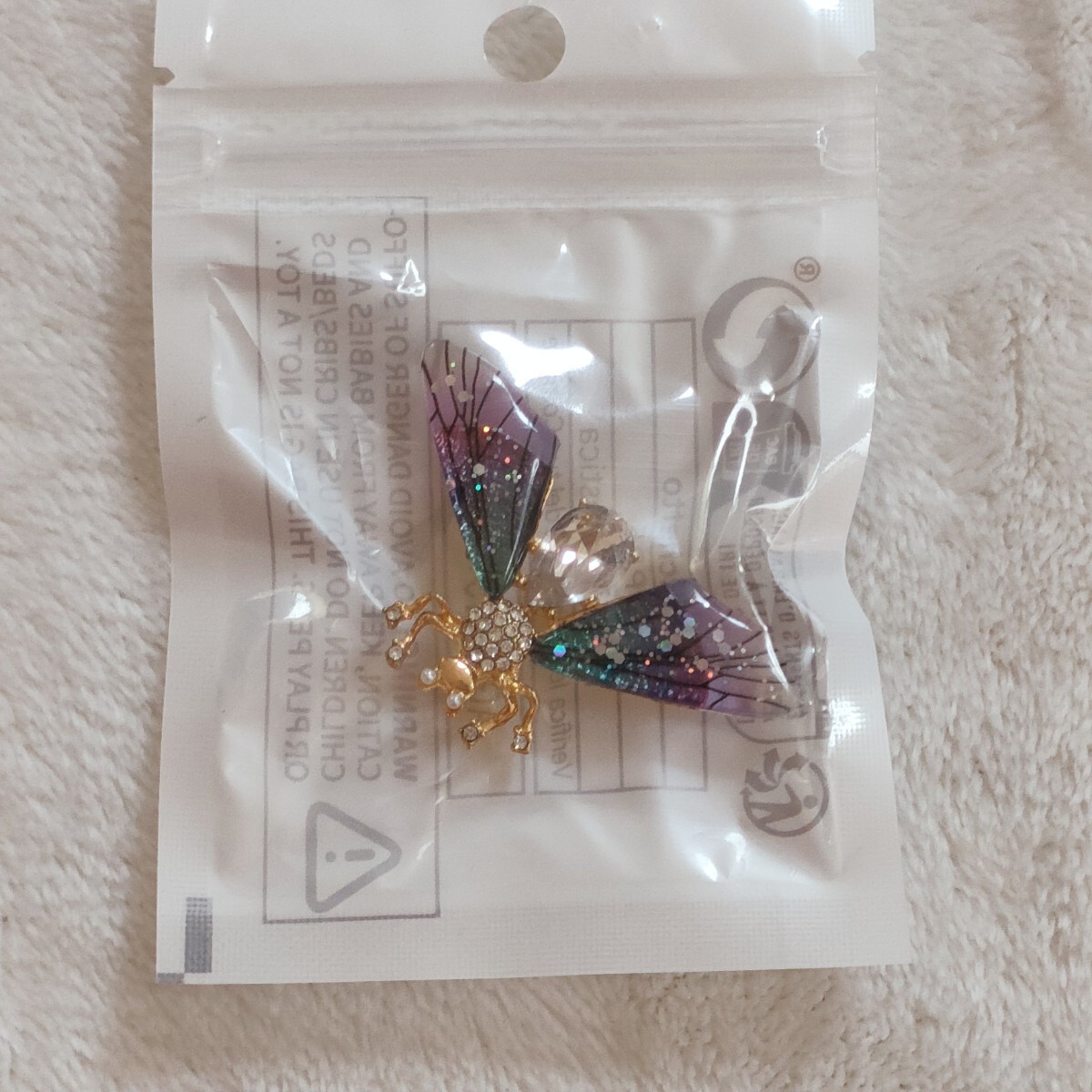 - 新品 未開封 昆虫モチーフ ブローチ グリッター入り羽 ラインストーン装飾 ゴールド 紫 青 透明 キラキラ アクセサリー