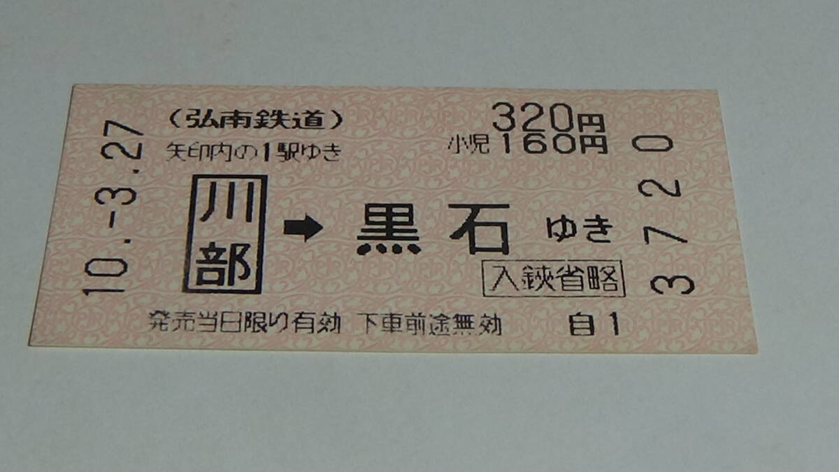 - 弘南鉄道【廃止線】 軟券 券売機発行券 川部→黒石ゆき 10-3.27
