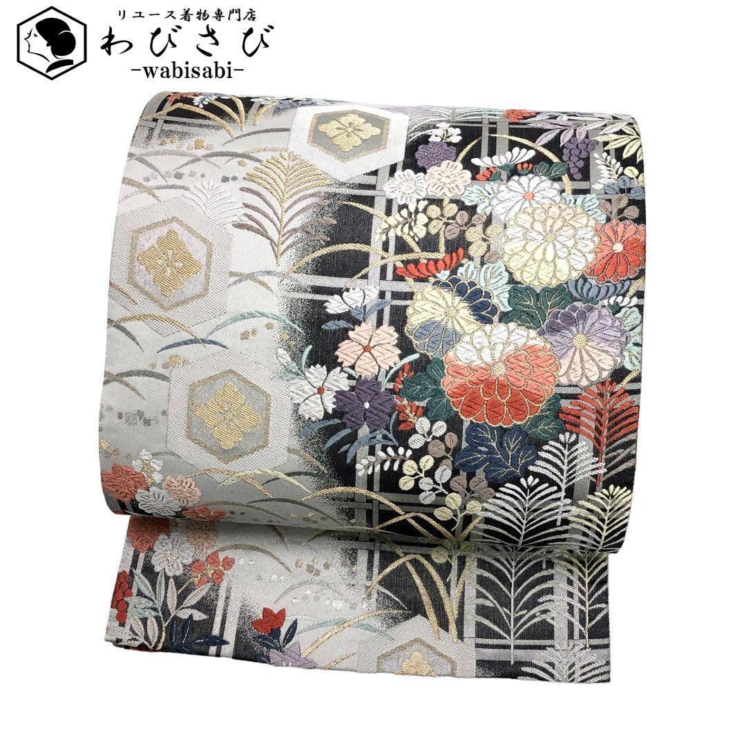 > 袋帯 小袖亀甲詰紋 美しい四季の花々に亀甲 薄灰色 O-2946 着物 きもの kimono 和服 和装 中古 リサイクル着物 【送料無料】