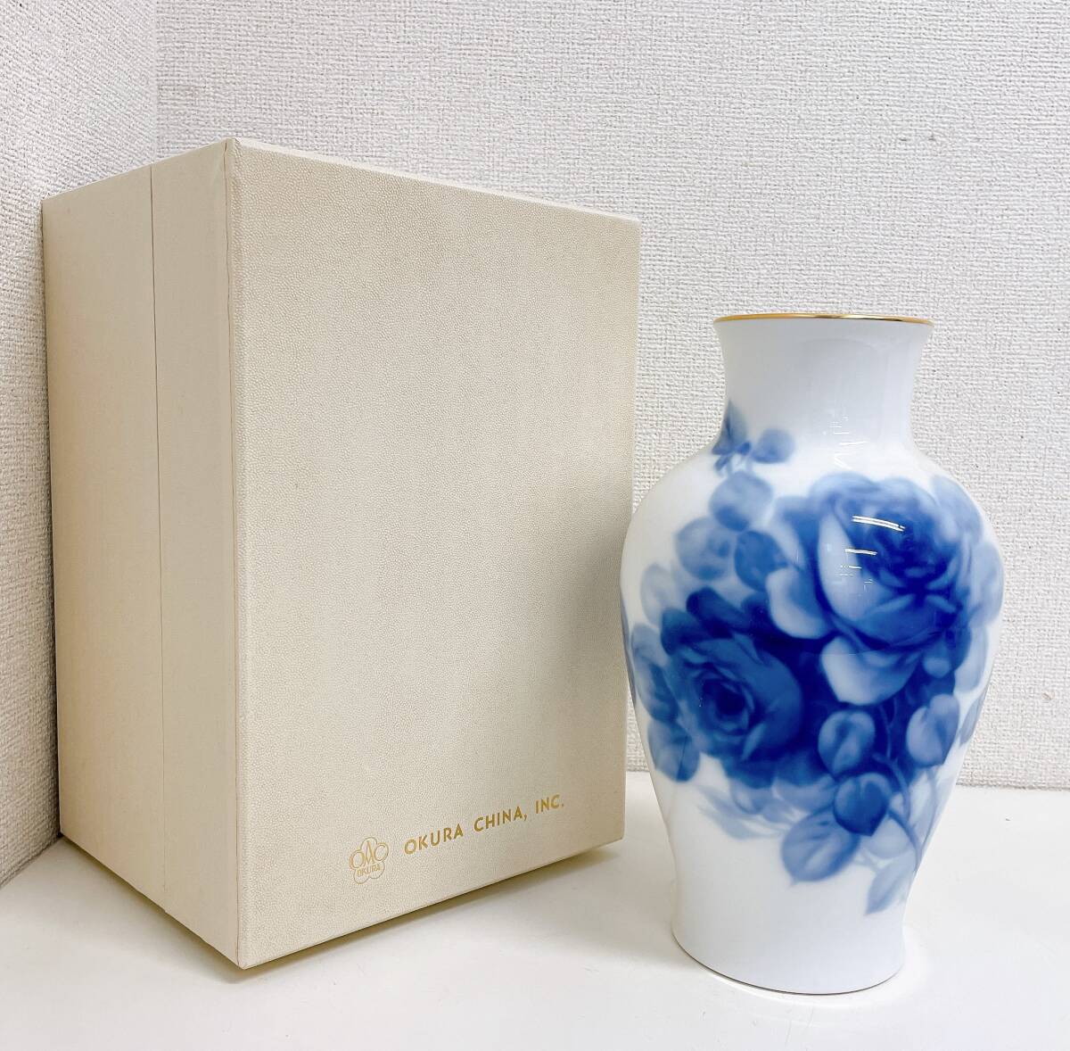 - 【大倉陶園 OKURA 花瓶 ブルーローズ】28㎝/外箱付/インテリア/花器/生花/A77-473