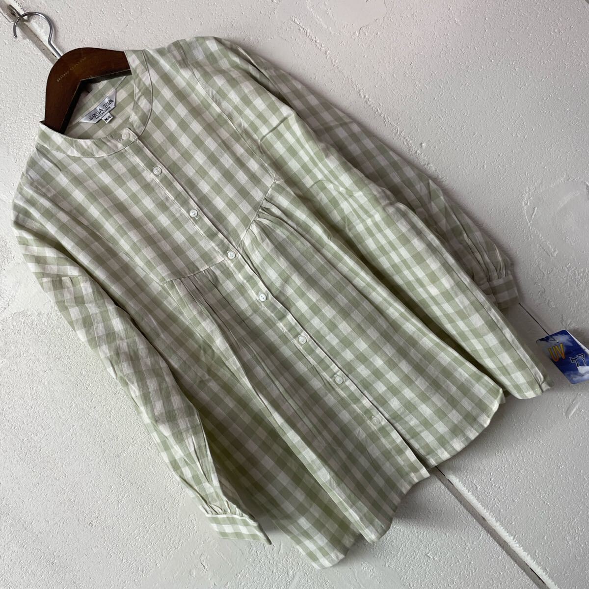 - 訳あり綿100%チェック柄ノーカラーシャツブラウスグリーン