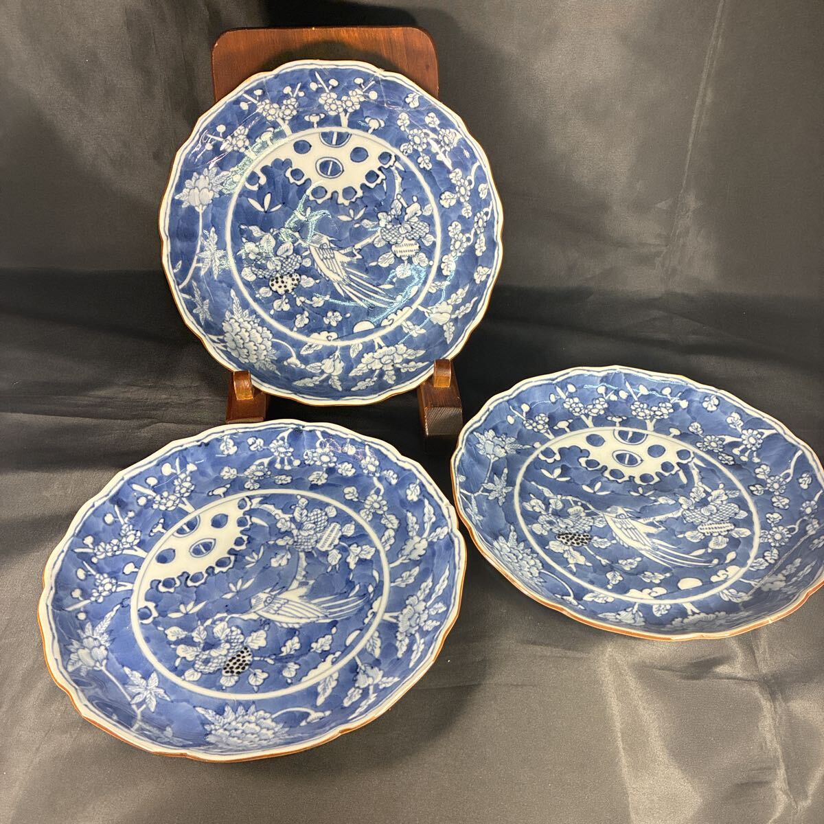 > 古染付祥瑞草花鳳凰文様七寸皿 明時代 成化年製 名品 磁器 陶器 陶芸 貫入 青花 釉下彩 職人の補正あり。中国美術