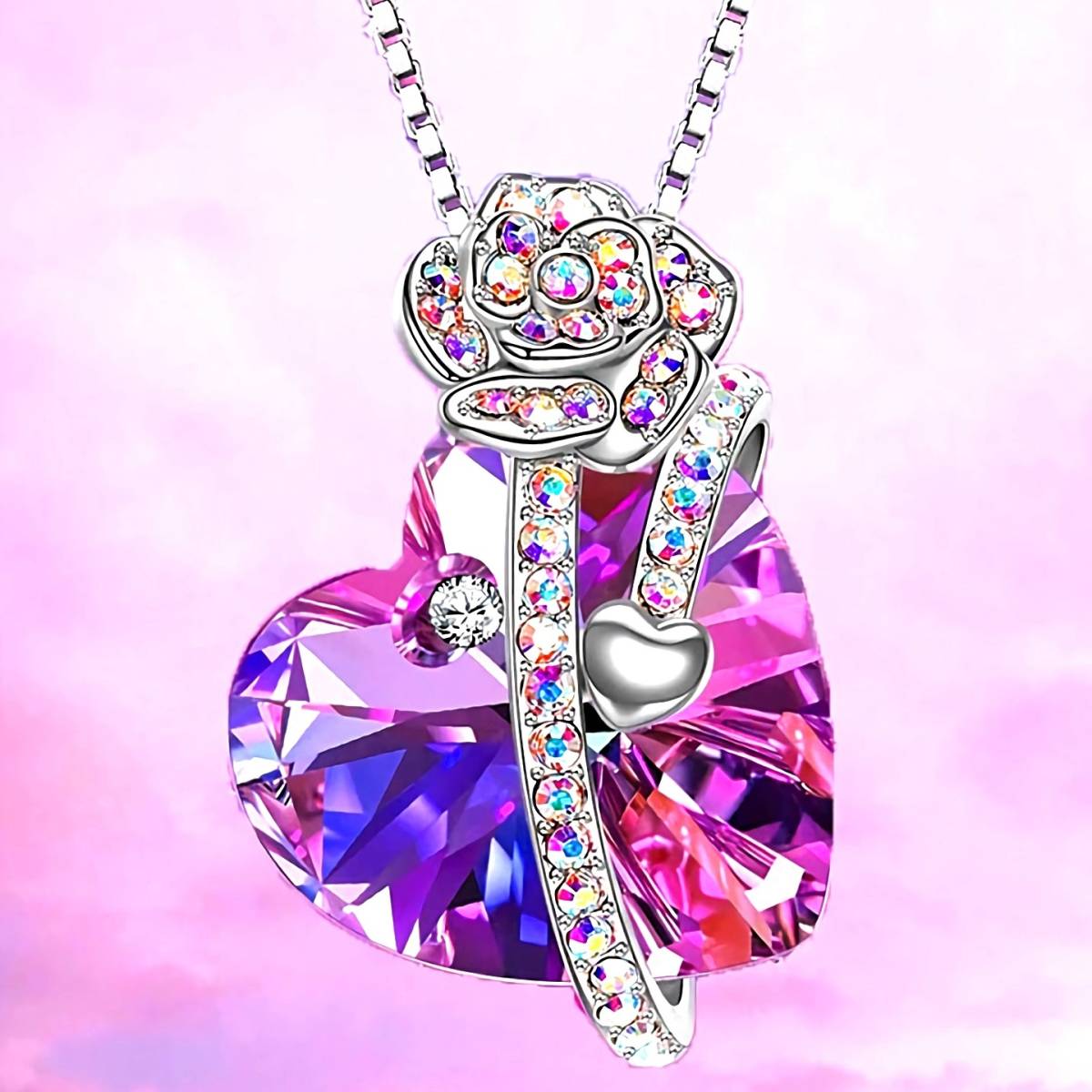 - 新品1円~★送料無料★薔薇ハート紫水晶アメジスト 虹色ダイヤプラチナ仕上925シルバーネックレス 誕生日プレゼント旅行秋祭ギフト国内発送