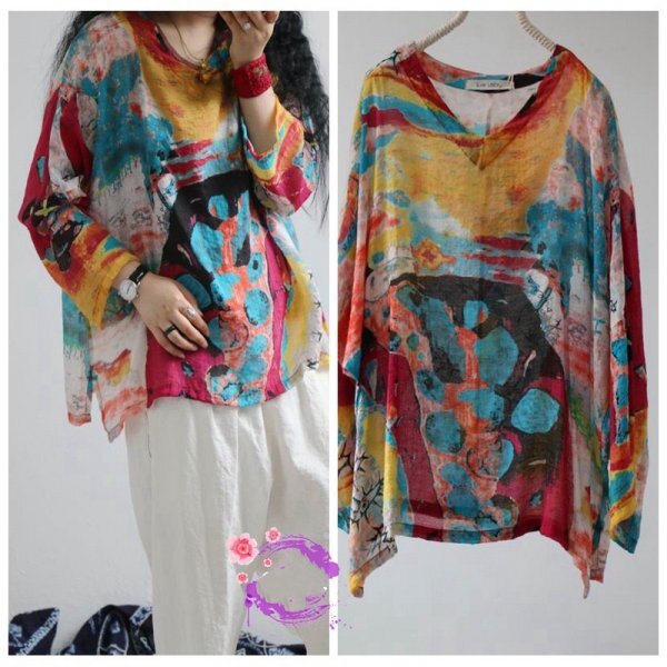 - セール Vネック チュニック 花柄 トップス アンティーク風 ロマンファッション ゆったり 綿55% 麻45% 柄2