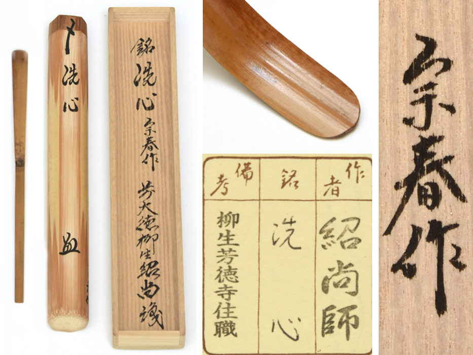 - 宗春 (作) 橋本紹尚 銘「洗心」 茶杓 共筒 共箱 茶道具 竹工芸 竹芸 木工芸 美品 u0646a