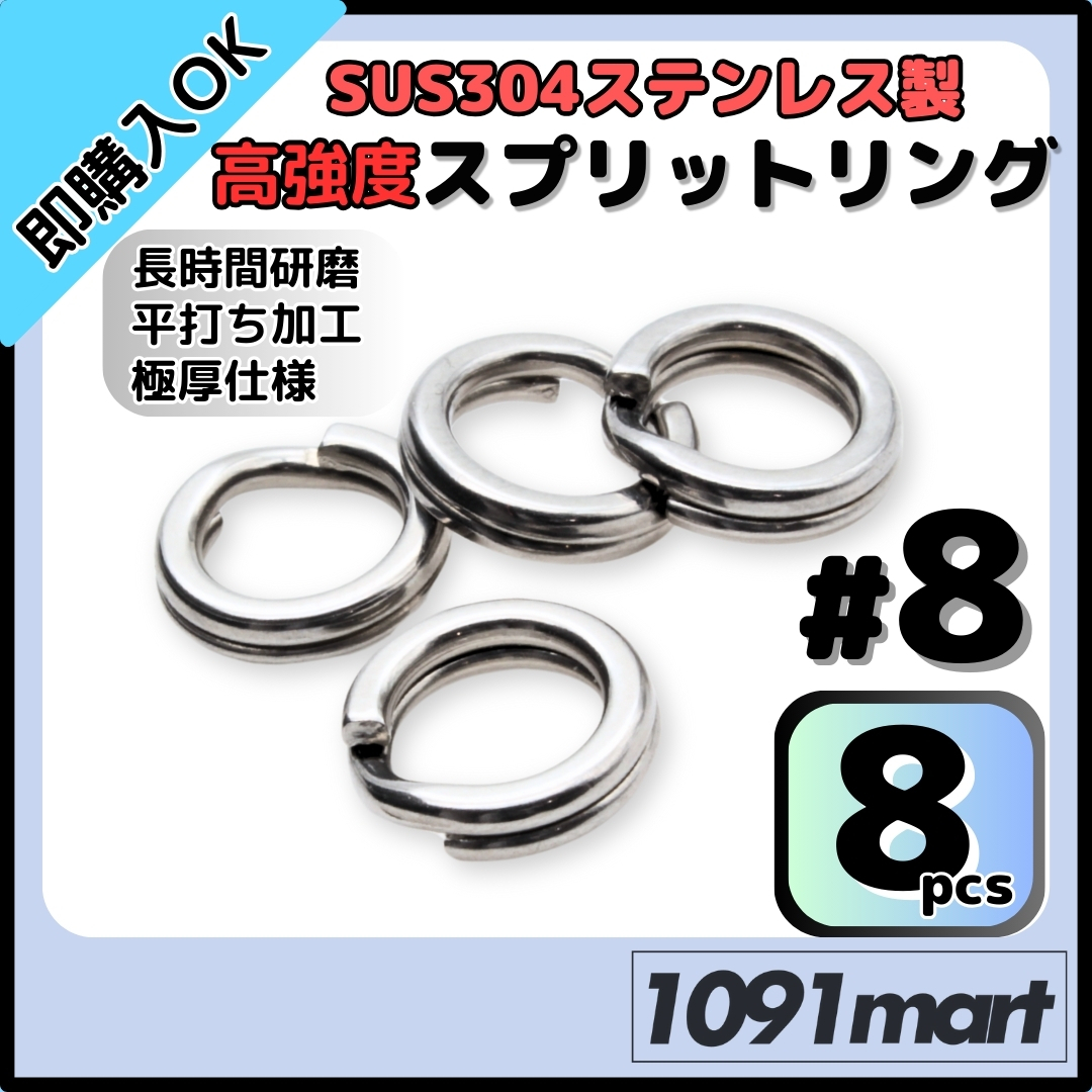 - SUS304 ステンレス製 強力 平打ち スプリットリング #8 8個セット ソルト対応品 長時間研磨【ミニレター】
