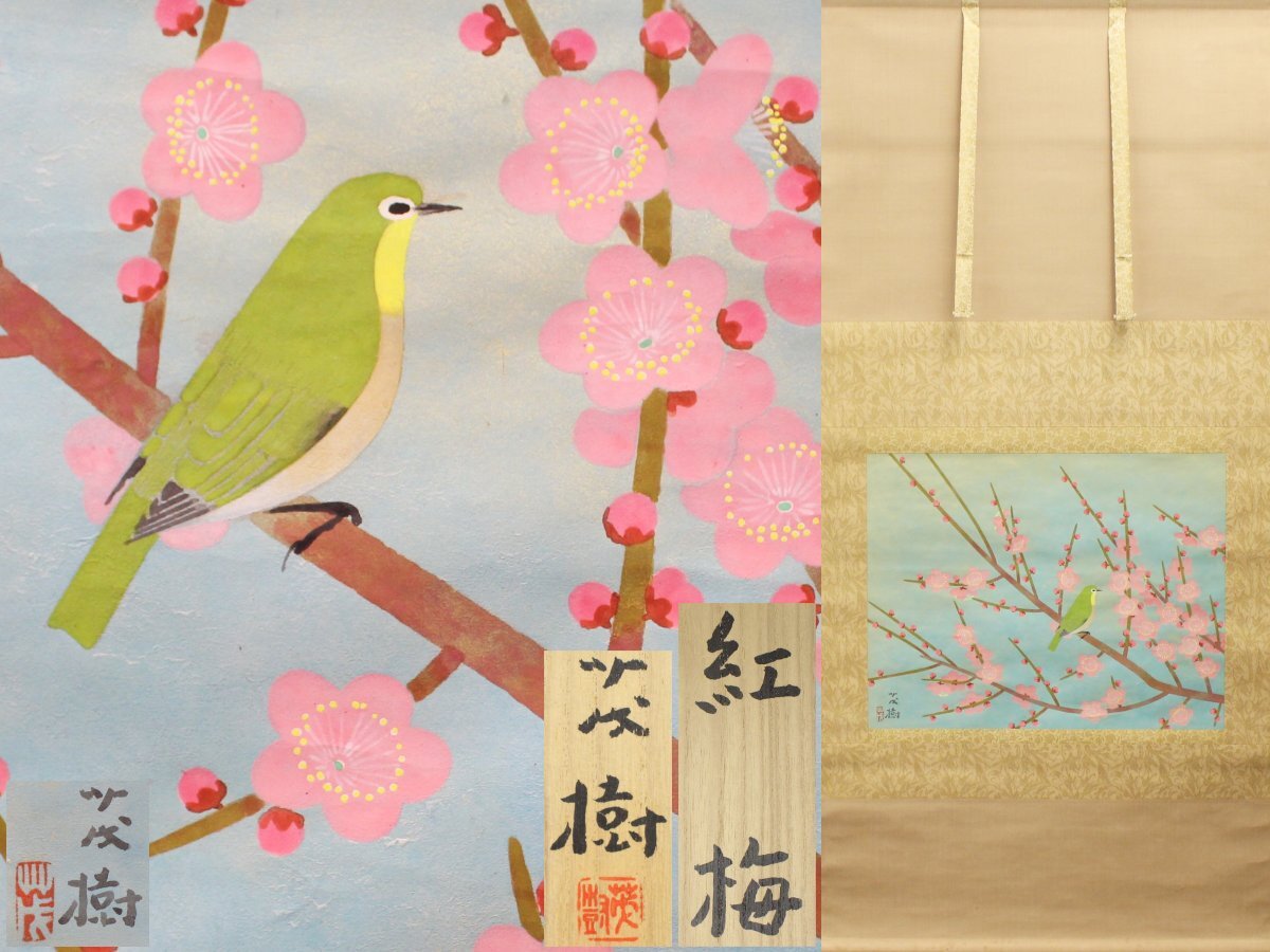 - ◆掛軸・黒光茂樹・「紅梅」・花鳥画・日本画・真作・太巻・共箱・外紙箱・検 金島桂華◆a8130h