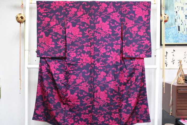 > きもの今昔8823 アンティーク小紋きもの 正絹羽二重地黒地赤色の四季の花柄 多めの裾綿入り 身丈145CM