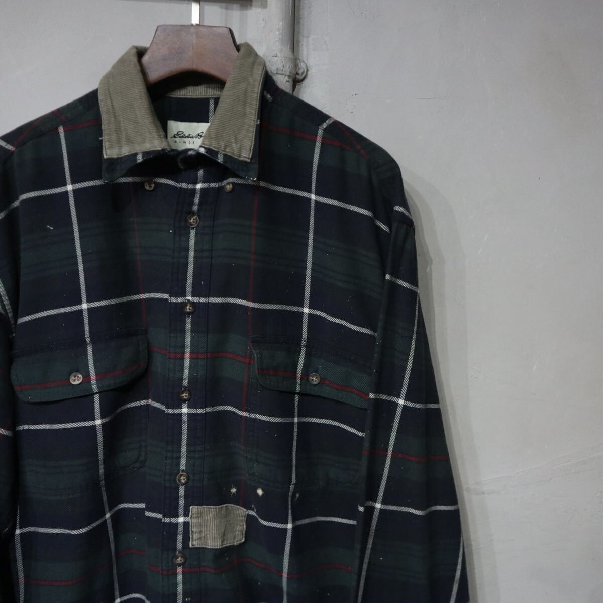 > 【即決】eddie bauer エディーバウアー フランネルシャツ チェック柄 グリーン 緑 コーデュロイ リペア ボロ BORO 古着 M